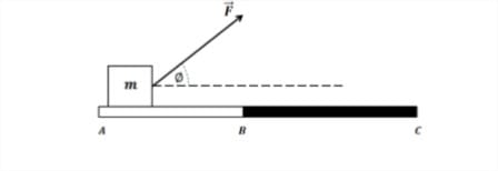 Un cuerpo en reposo de masa de 10.0 kg que esta sobre una superficie sin fricción (??̅̅̅̅) y se le aplica una fuerza F= 25.0 N formando un ángulo (?) de 27.0° con la horizontal. Después de recorrer los 30.0 m, la fuerza deja de ser aplicada y el cuerpo ingresa a una superficie rugosa (??̅̅̅̅) cuyo coeficiente de fricción es de 0,300. Calcular: a) El valor de la aceleración del cuerpo en el instante que deja la superficie sin fricción y b) la distancia que alcanza a recorrer en la superficie con fricción hasta que se detiene.