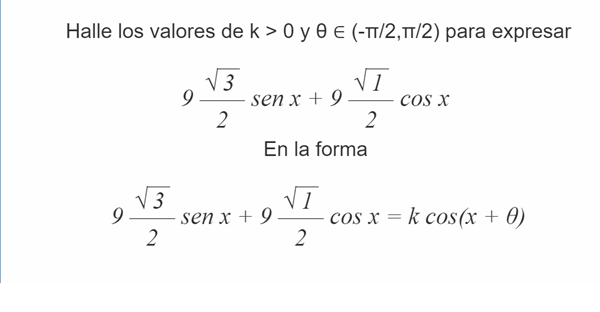 $$\begin{align}&9((\sqrt(3))/2)sen x + 9 ((\sqrt(1))/2)cosx=k\\&\cos(x+θ)\\&\\&Respuesta=\\&k=????\\&\\&θ=???/???\end{align}$$Debo sacar el valor de k y el angulo pero no tengo idea de como.