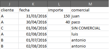 Los datos de facturación vienen de otra consulta ODBC, (igual que la matriz expuesta); y se trata de cruzarlas para poder representar el histórico de facturación por comercial y cliente, de tal forma que, por ejemplo, JUAN tendrá asignadas ventas del cliente A hasta el 31/03/2016, y las que se hayan generado después se deben asignar a PACO.