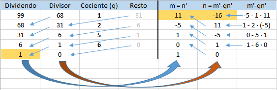 Esos dos últimos datos se pasan en la misma fila a las columnas m, n e iremos completándolas hacia arriba. La nueva columna m será siempre la antigua n. Y la nueva columna n se calcula como la m de la fila de abajo menos el cociente de esa fila por la n de la fila de abajo, es lo que he llamado