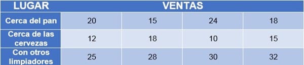La tienda del Hospital de los trabajadores del estado, lanzó un nuevo limpiador de uso múltiple, cuya demanda se prueba exhibiéndolo en tres lugares diferentes, dentro de varios supermercados. En el cuadro que sigue, se muestra el número de botellas de 12 onzas, que se vendieron en cada ubicación.