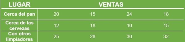 La tienda ISSTE de los trabajadores del estado lanzó un nuevo limpiador de uso múltiple, cuya demanda se prueba exhibiéndolo en tres lugares diferentes, dentro de varios supermercados. En el cuadro que sigue, se muestra el número de botellas de 12 onzas, que se vendieron en cada ubicación.