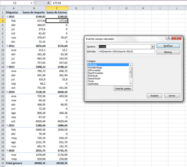En la siguiente tabla dinámica, tengo unos gastos cuantificados por meses y años, que los suma en el campo “Suma de importe”. El campo “Suma de Exceso” es un campo calculado en el que si el valor de importe es superior a 300, calculo la diferencia, y si es inferior a 300 le asigno el valor de 0. La duda que tengo es la siguiente: cómo puedo hacer que en los valores de los meses me calcule el campo calculado, pero en los totales de los años me sume los valores de los meses, ¿y no que también funcione como un campo calculado? Es decir, cómo puedo hacer que el valor de 2011 me sume 248 (¿la suma de los excesos de los meses) en lugar de restar 300 al valor de 1540? Adjunto tabla con valores.