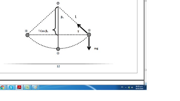 Un péndulo está compuesto por una esfera de masa m unida a cuerda ligera de longitud “ ᶩ “ . La esfera se suelta desde el reposo cuando la cuerda forma un ángulo β1 con la vertical, y el pivote en “O” no tiene fricción