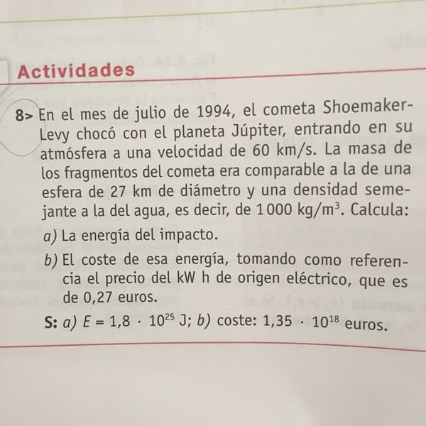 $$\begin{align}&E_c=\frac{1}{2}mv^2\\&\\&\text{Calculamos la masa en kg}\\&\text{Para ello calculamos el volumen en} m^3\\&\\&V=\frac 43 \pi r^3=\frac 43\pi(13500m)^3= 3.2805·10^{12}·\pi\,m^3\\&\\&m=\gamma·V= 1000\,kg/m^3 · 3.2805·10^{12}·\pi\,m^3=\\&3.2805·10^{15}·\pi\; kg\\&\\&\text{La velocidad se debe pasar a m/s}\\&\\&v= 60km/s = 6·10^4 m/s\\&\\&\\&\text{Luego la energía cinética fue}\\&\\&E_c= \frac 12 3.2805·10^{15}·\pi\; kg·(6·10^4 m/s)^2=\\&\\&1.64025·10^{15}·\pi\, kg·36·10^8 m^2/s^2=\\&\\&5.9049·10^{24}\pi\;kg·m^2/s^2 \approx\\&\\&1.855079046\times10^{25} J\\&\\&\\&b)\\&1J = 1W·s\\&\\&1 kW·h = 1000W·3600s = 3.6·10^6J\\&\\&\text{Luego los kilovatios hora del impacto fueron}\\&\\&\frac{1.855079046\times10^{25} J}{ 3.6·10^6J}= 5.15299735 · 10^{18} kW·h\\&\\&\text{Y su precio sería:}\\&\\&PVP=5.15299735 · 10^{18} kW·h·0.27€/(kW·h)=\\&1.391309285\times10^{18}€\end{align}$$