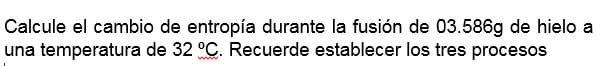 $$\begin{align}&\Delta S_1=\frac {Q_{rev}}{T}= \frac{m·L_f}{T}=\\&\\&L_f = \text{calor latente de fusión del agua}= 333.55\,J/g\\&\\&\frac{3.586kg·333.55\,J/kg}{273.15\,K}= 4.378950394\; J/K\\&\\&\\&\\&\text{El proceso segundo es el aumento de temperatura a }\\&\\&32ºC= 305.15K\\&\\&\text{El incremento de entropía aquí es}\\&\\&\Delta S_2=m·C_p·ln\left(\frac{T_f}{T_i}\right)=\\&\\&donde\\&\\&C_p=\text{Capacidad calorífica del agua}=4.1813\,J/g·K\\&T_f=\text{Temperatura final}=32ºC=305.15K\\&T_i=\text{Temperatura inicial}=0ºC = 273.15K\\&\\&=3.586g·4.1813\,(J/g·K)·ln\left(\frac{305.15}{273.15}\right)=\\&\\&1.661086477\,J/K\\&\\&\text{Luego el cambio de entropía total es}\\&\\&\Delta S_1+\Delta S_2=4.378950394\; J/K+ 1.661086477\,J/K=\\&\\&6.040036871\,J/K\end{align}$$Y eso es todo, sa lu dos.