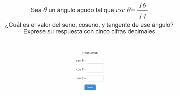 $$\begin{align}&csc\,\theta = \frac{16}{14}=\frac{8}{7}\\&\\&\text{La cosecante es 1 entre seno}\\&csc \,\theta=\frac{1}{sen\,\theta}\\&\\&\frac {8}{7}=\frac 1{sen\,\theta}\\&\\&sen\;\theta=\frac 78=0.875\\&\\&\\&\\&\text{Y de }\cos^2x+sen^2x=1\\&\\&\cos\,x= \pm \sqrt{1-sen^2x}\\&\\&\text{como el ángulo es agudo, está en el primer}\\&\text{cuadrante y el coseno es positivo}\\&\\&cosx= \sqrt{1-\frac{49}{64}}=\frac{\sqrt{15}}{8}=0.48412\\&\\&\\&\\&tg\,\theta= \frac{sen\theta}{\cos \theta}=\frac{\frac 78}{\frac{\sqrt{15}}{8}}=\frac{7}{\sqrt{15}}= \frac{7 \sqrt {15}}{15}=1.80739\end{align}$$