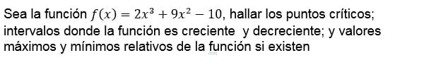$$\begin{align}&f'(x)=6x^2+18x \\&\\&6x^2+18x =0\\&6x(x+3)=0\\&entonces\\&6x=0\\&o\\&x+3=0\\&entonces\\&x1=0\\&x2=-3\end{align}$$una vez obtenidos los puntos críticos de la función siendo estos -3 y 0 analizamos los intervalos de crecimiento y decrecimiento en todo el dominio de la función desde -∞ a +∞ pero debemos dividir el dominio según los puntos críticos ya que es ahí donde puede o no cambiar el crecimiento o decrecimiento por lo que nos quedarian los siguientes intervalos (-∞;-3) (-3;0) (0;+∞)