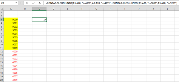=CONTAR.SI.CONJUNTO(A3:A20, ">=4000",A3:A20, "<=4299")+CONTAR.SI.CONJUNTO(A3:A20, ">=9000",A3:A20, "<=9299")