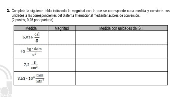 Completa la siguiente tabla indicando la magnitud con la que se corresponde cada medida y convierte sus unidades a las correspondientes del Sistema Internacional mediante factores de conversión.