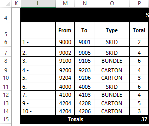 =Y(M6>=9000,M6<=9099,N6>=9000,N6<=9099)*SUMAR.SI.CONJUNTO(P6:P14,O6:O14,"SKID")