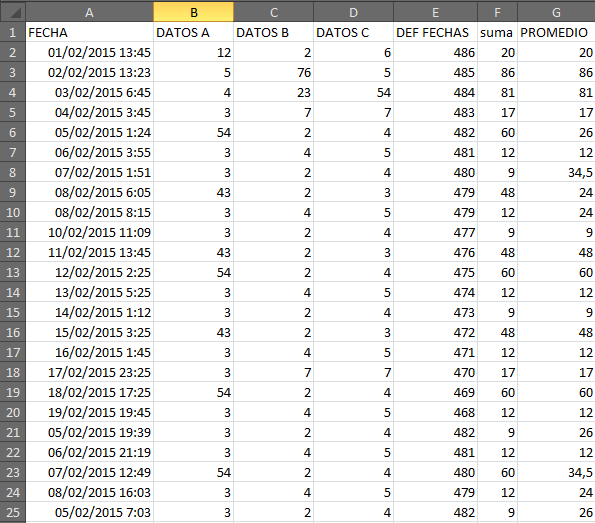 Tengo cuatro columnas "FECHA" "DATOS A" "DATOS B" "DATOS C". La columna FECHA tiene muchos datos con el siguiente formato (dd/mm/aaaa hh:mm:ss) de todo un año. Es posible que me puedan ayudar con una macro que tome todos los datos de un día y promedie los valores de cada columna restante DATOS A, DATOS B, DATOS C y vaya al siguiente día y promedie y así sucesivamente hasta el final.