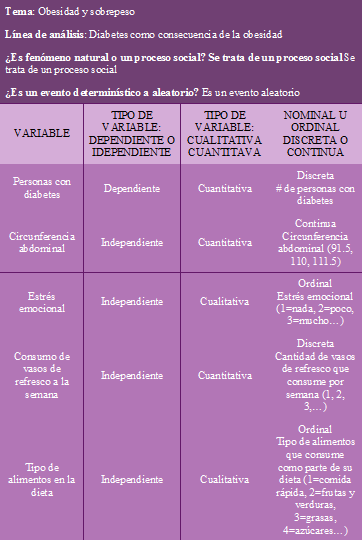 3. A partir de eso, determina las variables: cualitativas –nominales u ordinales–, cuantitativas –discretas o continuas–, y dependientes e independientes, que pueden ser medidas y permitan obtener más información, y elabora una tabla como se muestra en el ejemplo.