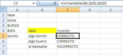 =SI(CONTAR(HALLAR({"BASE";"BOLSA"};B5));"CORRECTO";"INCORRECTO")