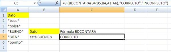 =SI(BDCONTARA(B4:B5, B4, A1:A6);"CORRECTO";"INCORRECTO")