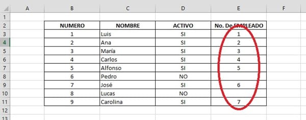Tengo una nómina de empleados activos e inactivos, todos están enumerados consecutivamente, quisiera una fórmula para que en una columna me cuente el numero correspondiente al trabajador activo según la misma lista.