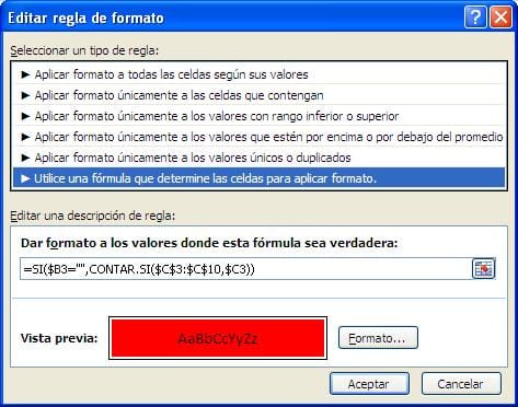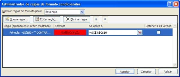 En mi hoja tengo una formato condicional en la columna C que pone fondo a los número duplicados, en la columna B tengo celdas vacías y con datos, lo que quiero es que al momento de que las celdas de la columna B ya no estén vacías cualquiera sea, elimine el fondo a la celda de la columna C.