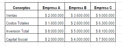 Con base en los siguientes datos, determine cual de las empresas ( A, B, O C) arrojo mejores resultados en los aspectos de: eficiencia en la movilización de recursos, eficiente cobertura de los costos, rentabilidad sobre la inversión y rendimiento del capital social: