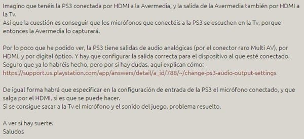 La PS3 se encuentra conectada a un splitter a través de un HDMI, para saltar la protección DCHP que tiene instalada la consola, a través de este splitter conecto otro cable HDMI, que se dirige hacia la capturadora y de esta otro cable que lo une al monitor, haciendo que la capturadora se encuentre de "intermediario" entre la PS3 y el monitor, esta capturadora la tengo conectada vía USB al PC, desde donde tengo instalado el software y los correspondientes drivers, el problema aparece cuando quiero grabar el audio de la consola, curiosamente en los menús de la consola, el sonido si se oye, pero al entrar a cualquier juego se empiezan a oír "chirridos" como si el sonido estuviese codificado o algo así, además la capturadora no me graba el audio del juego, solo mi voz (a través del micrófono del PC), sin embargo si conectamos la PS3 directamente al monitor o a la televisión el sonido si se oye, y a través del splitter también se oye, el fallo ocurre parece ser cuando se conecta a la capturadora,