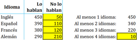 En una reunion de 500 alumnos sabemos que 450 hablan ingles, 380 hablan frances, 390 hablan español y 290 hablan aleman Cual es el minimo numero de diplomaticos que podemos asegurar que hablan los cuatro idiomas