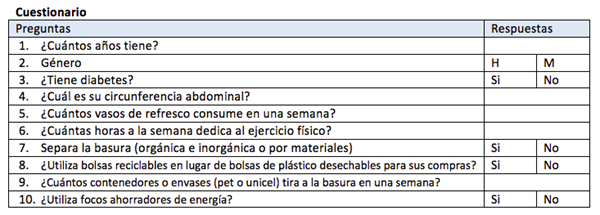 Un documento en que presentes los resultados del muestreo, por medio de una encuesta, a personas que tú conozcas. Debes mostrar una tabla con los datos organizados, las respuestas a las preguntas planteadas, una explicación a los problemas expuestos: “Incidencia de diabetes en mi entorno cercano” y “Acciones de las personas de mi entorno en el ambiente”; y una gráfica que muestre tus argumentos.