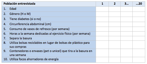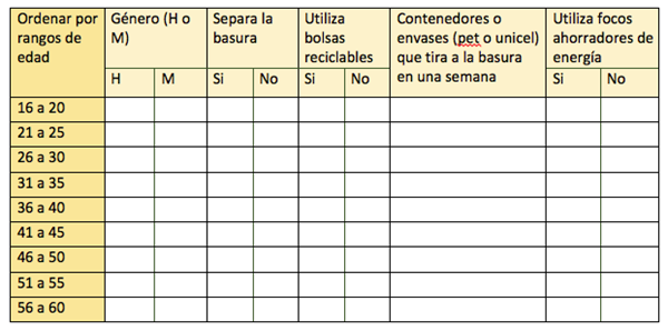 2. Ordena los datos recabados. Te sugerimos una tabla como la siguiente, realízala en una hoja de cálculo (programa Excel).