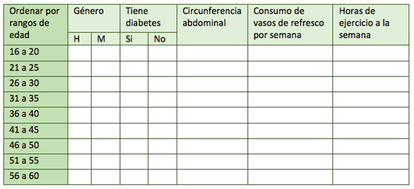 – La incidencia de diabetes en relación con la edad, el género la circunferencia abdominal el consumo de refrescos y horas de ejercicio a la semana. ¿Encuentras alguna relación? Explica cuáles. Si quieres apoyarte revisa las ligas: http://promocion.salud.gob.mx/dgps/descargas1/estrategia/Estrategia_con_portada.pdf y http://www.redalyc.org/articulo.oa?id=14230108
