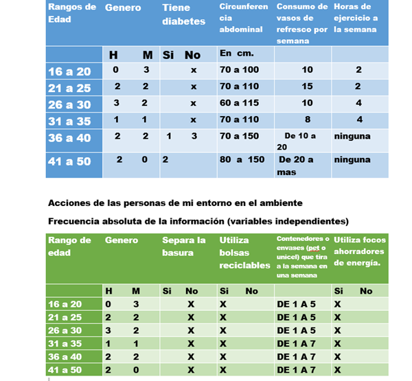 Por medio de una encuesta, a personas que tú conozcas. Debes mostrar una tabla con los datos organizados, las respuestas a las preguntas planteadas, una explicación a los problemas expuestos: “Incidencia de diabetes en mi entorno cercano” y “Acciones de las personas de mi entorno en el ambiente”; y una gráfica que muestre tus argumentos.