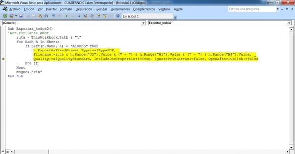 Estoy generando un documento Excel y he creado unas macros que me permiten exportar a pdf una información que se genera dentro de la propia hoja relativa a mis alumnos.