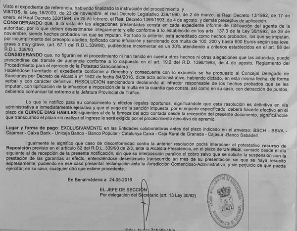 Ahora, hemos recibido un aviso Resolución Sancionadora con una multa de €200, que hemos pagado (por miedo a agravar las cosas!) El 30 de mayo.