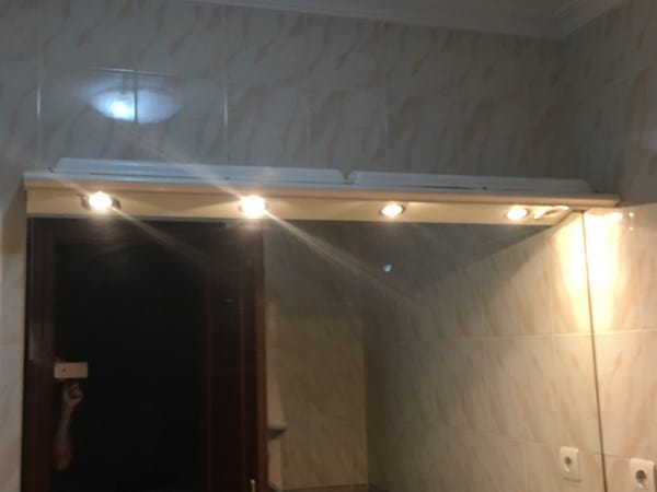 Y así están dispuestos en el baño (mueble encima del espejo donde están empotrados 4 focos) pero no me queda muy claro como van conectados entre sí. Pude ver que cada foco está empalmado con cinta aislante pero no sé donde acaban (además hay un enchufe y un interruptor para apagarlo independientemente de la luz del techo