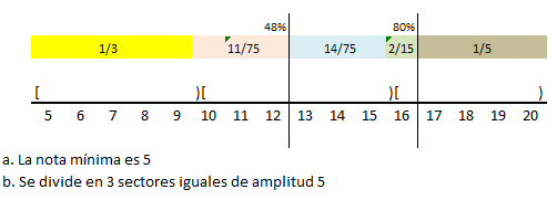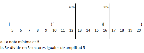 de 3 intervalos de amplitud iguales a 5. Si la nota mínima es igual a 5, el 48% de