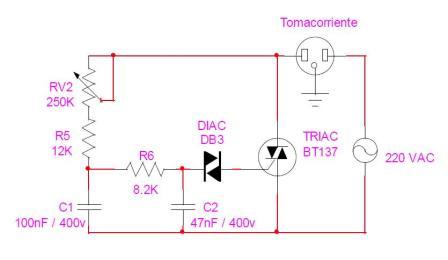 Con perdón, el "dimmer" que Vd. ha elegido es bastante impreciso por la ausencia del "Diac", que lo hace más preciso, porque es necesario que la carga de la red RC, alcance su nivel de disparo, que es de alrededor de 30. El 99% de los comerciales lo llevan y responden a este montaje:http://3.bp.blogspot.com/-AVnLJ9NnP7k/TcHRrs4nbII/AAAAAAAAAB0/r2WgZqxubS8/s1600/dimmer.JPG Saludos. - Botijo Antiguo