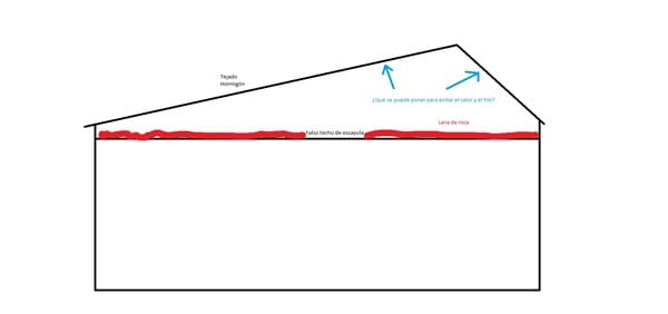 - Sí, es un dibujo hecho a mano alzada, pero sí. El orden correcto por las capas de fuera hacia adentro en el tejado es: Proyectado de corcho, teja negra (pero no es pizarra), hormigón. Luego hay un espacio vacío (el que quiero aprovechar para aislar) y luego el techo de escayola.