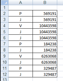Cuento con la versión de Excel 2007, y requiero de su ayuda para formular una macro que me permite evaluar en la columna B, números que se repitan y de existir la coincidencia, copie de la columna A el carácter superior y lo pegue en la misma columna A en las filas donde encontró la coincidencia, les copio un ejemplo: