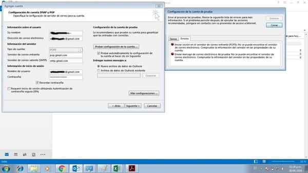 He intentado configurar mi cuenta Gmail, en el outlook 2013, pero nada, lo hice a través de IMAP y POP y me dice el mismo error todo el tiempo, ya no se como configurar para que se conecte, habilite en mi cuenta gmail el POP(la ultima configuración que hice)