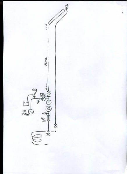 La instalación es tal cual el esquema. He revisado cada unión y no encuentro por donde puede fugar. Los tubos tienen coquilla en todo su recorrido e incluso la he abierto en algunos tramos buscando la soldadura de los tubos, pero nada. La conexión con los captadores y entre captadores está hecha sin soldadura: con uniones roscadas.