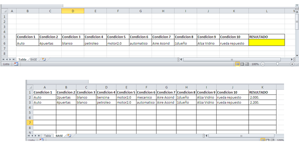 En la columna 11 (K) tengo un resultado cuando se reúnen las 10 condiciones anteriores.