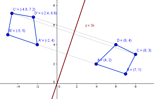 $$\begin{align}&3=\frac{sen\alpha}{\cos\alpha}\\&\\&3cos\alpha = sen\alpha\\&\\&\text{sustituyendo en la identidad fundamental}\\&\\&(3cos\alpha)^2+\cos^2\alpha=1\\&\\&10 \cos^2\alpha = 1\\&\\&\cos\alpha= \frac{1}{\sqrt{10}}\\&\\&sen\alpha= \sqrt{1-\frac 1{10}}= \frac 3{\sqrt{10}}\\&\\&\text{La ecuación del giro es}\\&\\&x'=x\,\cos\alpha+y\,sen \alpha\\&y'=y\,\cos\alpha-x\,sen\alpha\\&\\&\text{las coordenadas de los puntos serán}\\&\\&A'=\left(\frac{4·1+2·3}{\sqrt {10}},\frac{2·1-4·3}{\sqrt{10}}\right)=\left(\frac{10}{\sqrt {10}},\frac{-10}{\sqrt{10}}\right)\\&\\&B'=\left(\frac{7·1+1·3}{\sqrt {10}},\frac{1·1-7·3}{\sqrt{10}}\right)=\left(\frac{10}{\sqrt {10}},\frac{-20}{\sqrt{10}}\right)\\&\\&C'=\left(\frac{8·1+3·3}{\sqrt {10}},\frac{3·1-8·3}{\sqrt{10}}\right)=\left(\frac{17}{\sqrt {10}},\frac{-21}{\sqrt{10}}\right)\\&\\&D'=\left(\frac{6·1+4·3}{\sqrt {10}},\frac{4·1-6·3}{\sqrt{10}}\right)=\left(\frac{18}{\sqrt {10}},\frac{-14}{\sqrt{10}}\right)\\&\\&\text{La reflexión sobre este sistema es cambiar de signo de la y}\\&\\&A''=\left(\frac{10}{\sqrt {10}},\frac{10}{\sqrt{10}}\right)\\&\\&B''=\left(\frac{10}{\sqrt {10}},\frac{20}{\sqrt{10}}\right)\\&\\&C''=\left(\frac{17}{\sqrt {10}},\frac{21}{\sqrt{10}}\right)\\&\\&D''=\left(\frac{18}{\sqrt {10}},\frac{14}{\sqrt{10}}\right)\\&\\&\text{Y ahora calculamos respecto los ejes originales}\\&\\&x'''=x''\,\cos\alpha-y''\,sen \alpha\\&y'''=y''\,\cos\alpha+x''\,sen\alpha\\&\\&A'''=\left(\frac{10·1-10·3}{10},\frac{10·1+10·3}{10}\right)=\left(-2,4\right)\\&\\&B'''=\left(\frac{10·1-20·3}{10},\frac{20·1+10·3}{10}\right)=\left(-5,5\right)\\&\\&C'''=\left(\frac{17·1-21·3}{10},\frac{21·1+17·3}{10}\right)=\left(-\frac{23}{5},\frac{36}{5}\right)\\&\\&D'''=\left(\frac{18·1-14·3}{10},\frac{14·1+18·3}{10}\right)=\left(-\frac{12}{5},\frac{34}{5}\right)\\&\\&\text{Habrá que verificarlo}\\&\end{align}$$