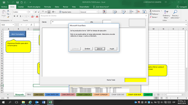 Cuando te aparece el mensaje de depurar, presiona el botón de depurar y dime qué línea de la macro se pone de amarillo.