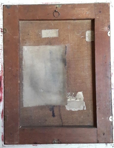 O al oleo, tamaño 36x27, 5. No está firmado. El soporte ha sufrido varias restauraciones como se puede ver en la foto del reverso. La fecha del cuadro quizás pueda ser de principios del siglo XIX, o anterior a juzgar por el bastidor que no lleva cuñas. El lienzo esta claveteado con tachuelas.