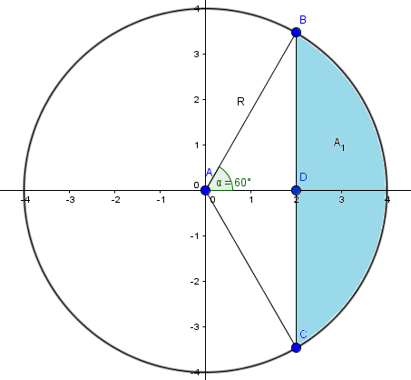 Una cuerda divide una circunferencia de radio R en dos arcos cuyas medidas se encuentran en la razón de 1:2. Determine la razón entre las áreas A1 y A2 obtenidas en el interior del círculo, limitadas por la cuerda y el arco correspondiente.