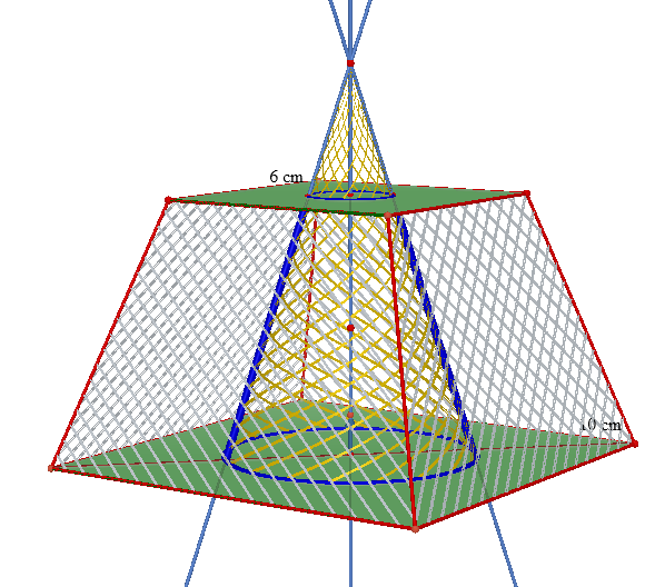 Un tronco de cono circular está inscrito en un tronco de pirámide de base cuadrada. Los radios de las bases del tronco de cono son 3 pulgadas y 1 pulgada, mientras que el lado de las bases de la pirámide son 10 pulgadas y 6 pulgadas. Si la altura del tronco de cono es 12 pulgadas, determine el volumen del sólido que queda fuera del tronco de cono pero dentro del tronco de pirámide.