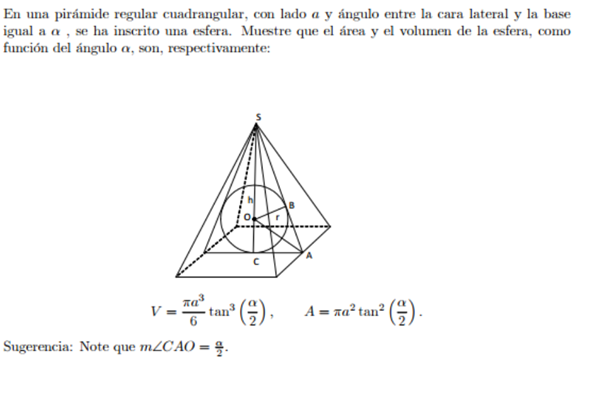 igual a α, se ha inscrito una esfera. Muestre que el área y el volumen de la esfera, como