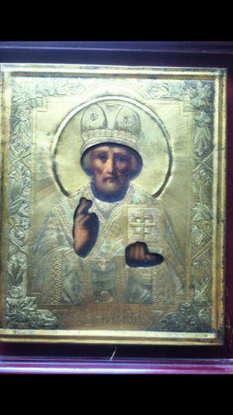 Me gustaría saber más sobre este cuadro, era de un tío mio que era coleccionista lo compro en europa y solo se que es ruso y antiguo pero no tengo idea de que tanto, el cuadro es pequeño, mide 20X18 con todo y marco, el fondo es la cara y las manos pintadas sobre un lienzo y cubiertas de una lamina de metal grabada.