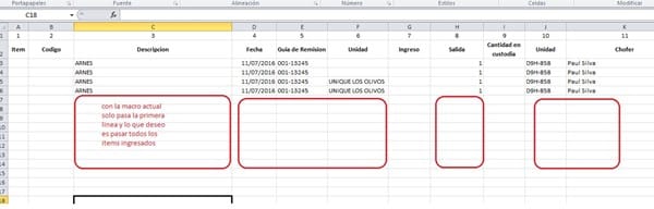 Esta es la base de datos donde debe de poner todos los items en los campos de "descripcion" y "salida" y los campos de "fecha","guia","unidad","chofer" se copien igual x la cantidad de items ingresados