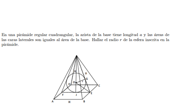 En una pirámide regular cuadrangular, la arista de la base tiene longitud a y las áreas de las caras laterales son iguales al área de la base. Hallar el radio r de la esfera inscrita en la pirámide.