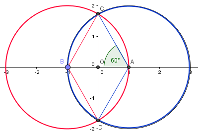 La región común de los dos círculos es la unión de dos segmentos circulares, el CAD y el CBD. Como las dos circunferencias son iguales calculamos el área de uno y la multiplicamos por dos. Para saber el área de un segmento circular debemos saber el ángulo correspondiente al sector.