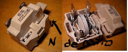 Este modelo es el que lleva mi nevera. Ves que tiene 3 patillas, bueno pues ahí debes conectar 1 cable solo, en la patilla generalmente marcada como N de neutro. Las otras 2 no valen para nada. Este va en la parte baja del triangulo que forman las 3 patillas del motor (donde hay 2 y tuviste que puentear) y en la parte superior (1 sola patilla) tendrás esta (la foto de abajo). Se mete primero la plana y luego el relé. Configuras bien el temporizador, conectas bien y la nevera te funcionará igual que lo hacía antes de que la placa petara, o incluso mejor, ya que antes me ponía que estaba a 4º. Después de hacer esto, el termómetro me pone 4º, pero no hay color con los 4º de antes y de ahora. Antes debía de estar a unos 10º o más. Ahora las cosas me duran 1-2 semanas más!. Si te entiendes bien con la luz, en la parte plana del relé fa la fase y en el relé propiamente va el neutro, pero si no entiendes o no tienes con que mirarlo, tu conecta indistintamente que te funcionará igual. Lo que si ya te digo de primeras, es que la luz te va a dejar de funcionar, al igual que la descongelación automática, pero por descongelar un congelador 1 vez al año manualmente no se ha muerto nadie! Si la nevera fuese no frost, habría que hacer lo mismo anteriormente hecho, pero poner otro temporizador para la resistencia que llevan, y este que se activa cada 8 horitas más o menos. El tiempo que tiene que estar la resistencia encendida no lo se. Y también habría que conectar el ventilador que tienen, este al temporizador de la nevera, para que cuando el motor encienda y haga frio, el ventilador lo extienda.