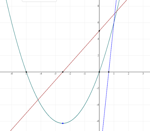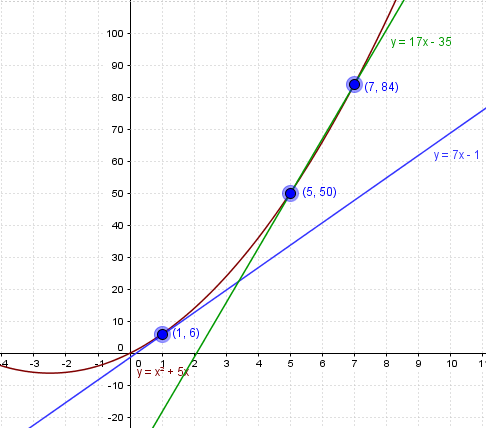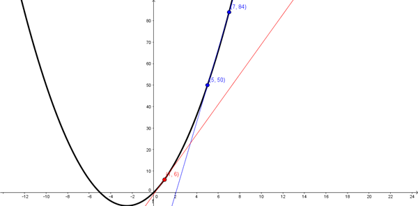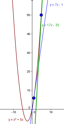 $$\begin{align}&m=\:\:\left(\:\:f\left(x_2\:\right)-f\left(x_1\:\right)\right)/\left(x_2-x_1\:\right)\end{align}$$Después obtuve la recta de mi secante derivando x^2 + 5x, el cual es 2x+5 (GRAFICA: LINEA ROJA)